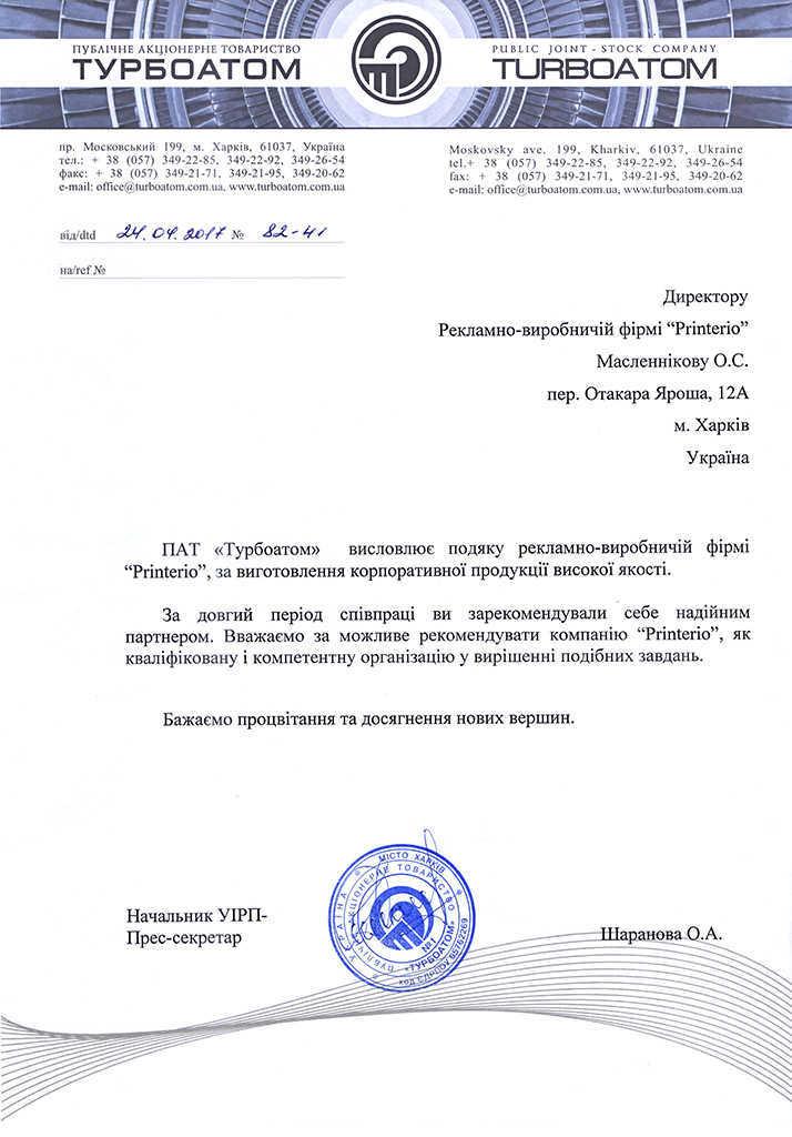 ПАО «Турбоатом» благодарит рекламно-производственную фирму «Printerio» за изготовление корпоративной продукции высокого качества. За долгий период сотрудничества вы зарекомендовали себя надежным партнером. Считаем возможным рекомендовать компанию «Printerio» как квалифицированную и компетентную организацию в решении подобных задач. Желаем процветания и достижения новых вершин.