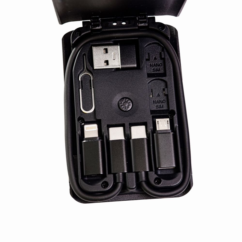 Переходники, которые есть в наборе, поддерживают работу с любым источником питания с портами USB/USB C. В комплект входят: кабель, различные разъемы (micro USB, USB, USB C), слоты для хранения SIM карт и карт SD, выталкивающий штифт.
