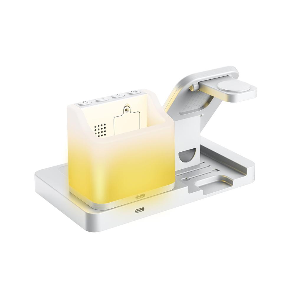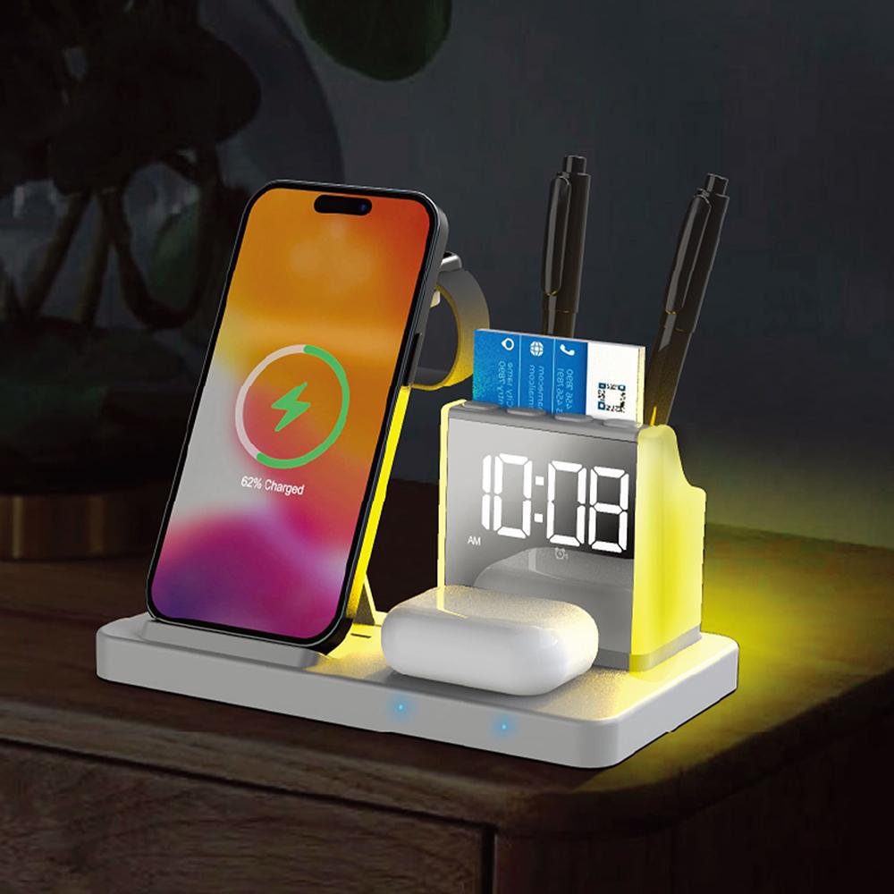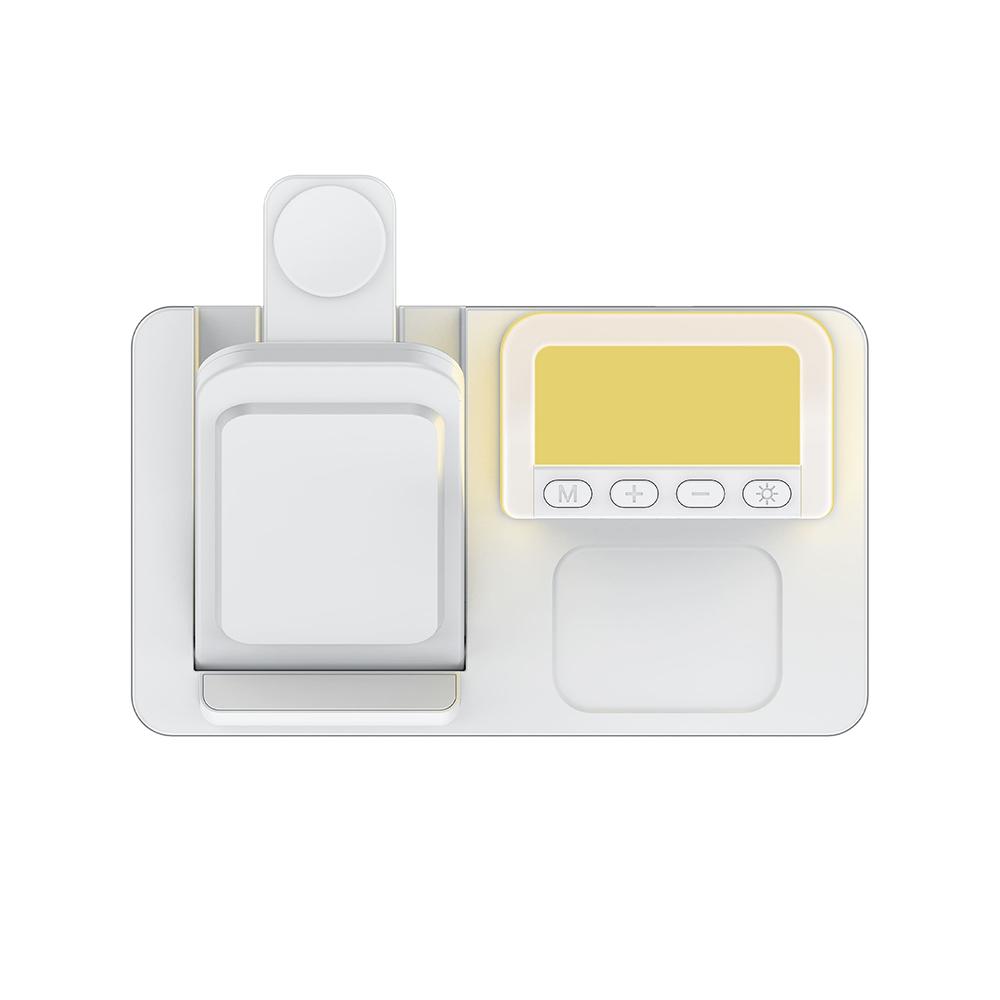 Беспроводное зарядное устройство с часами Time Dock. Можно заряжать смартфон, смарт-часы Apple Watch, наушники. Рекомендуется заряжать через блок питания QC3.0 quick charge. Удобная подставка: оптимально подобранный угол наклона позволяет использовать подставку во время просмотра видео на телефоне. Шнур питания зарядного устройства в комплекте. Телефон устанавливается на подставку, наушники TWS — на коврик, а смарт-часы — на специальную подставку. Зарядное устройство обеспечивает выходную мощность 15 Вт при размещении одного устройства на подставке и интеллектуально регулирует выходную мощность от 5 до 10 Вт в зависимости от потребностей энергопотребления устройства. Цифровой будильник, который идет в комплекте, питается от литиевой батареи. Часы имеют LED-экран с возможностью отображения времени в форматах 12 часов и 24 часа, 5 уровней регулировки яркости и кнопку отложенного сигнала. Панель часов также имеет режим ночного света и подставку для ручек на задней стенке часов.