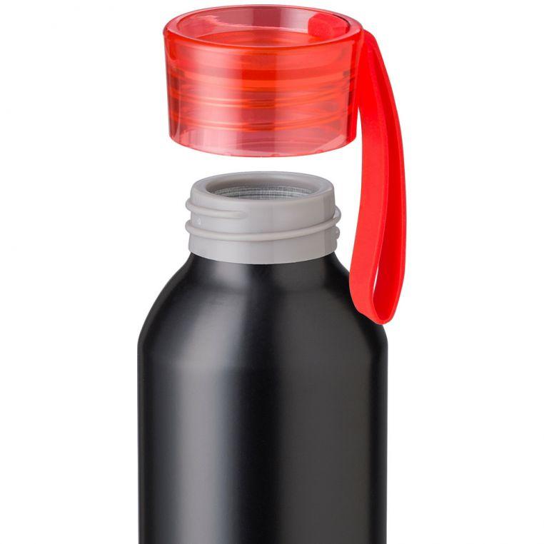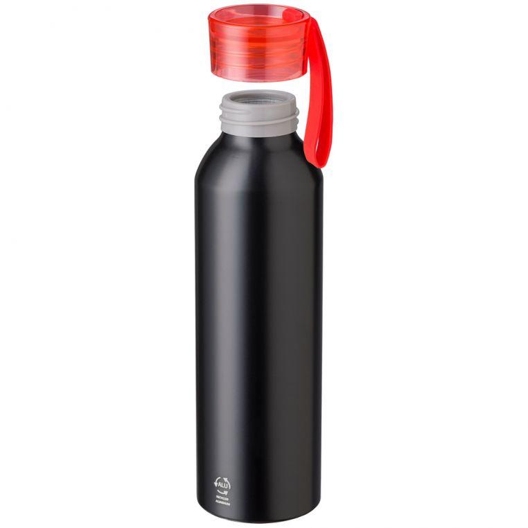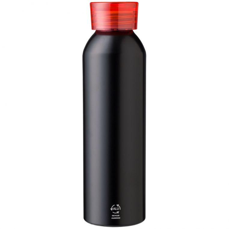 Бутылка в матовом алюминиевом корпусе. Оснащена прозрачной крышкой из полистирола и силиконовой лентой для удобства переноса. Удобный аксессуар для спорта и отдыха. Внизу на корпусе выгравирован логотип переработанного алюминия.