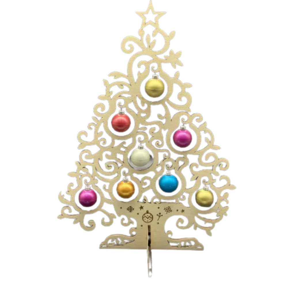 Изготовленная из фанеры, эта ёлка имеет размеры 43х30 см и комплектуется стильными декоративными игрушками.