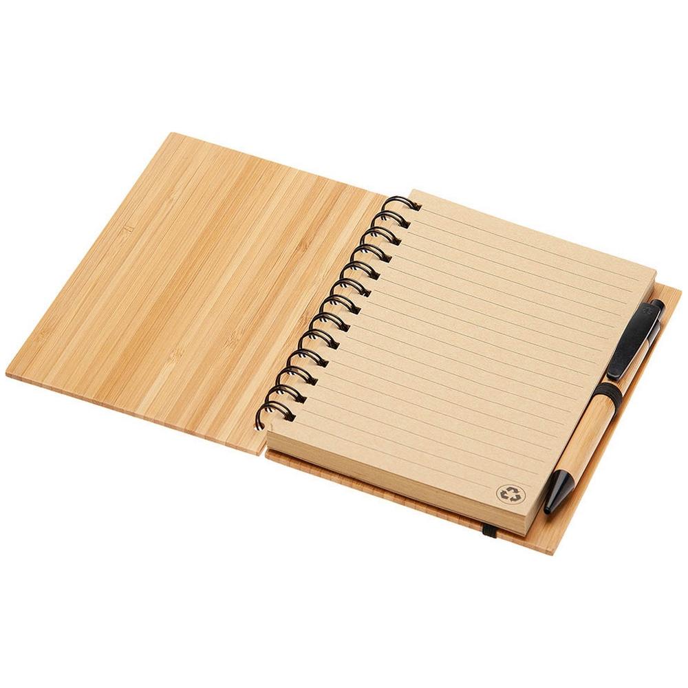 Блокнот с ручкой изготовлены из бамбука. Блокнот формата А5 с твердой обложкой, резинкой и держателем для шариковой ручки.