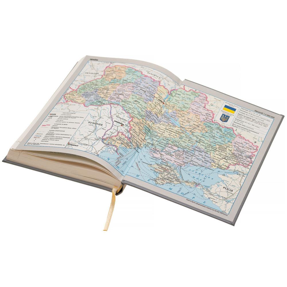 Блок – кремовая бумага 90 г/м², одна закладка, прошитый корешок дневника, перфорированные листы, чистый передний форзац, нахзац – карта Украины.