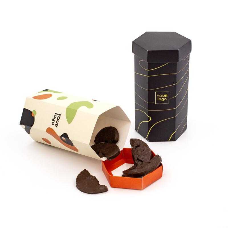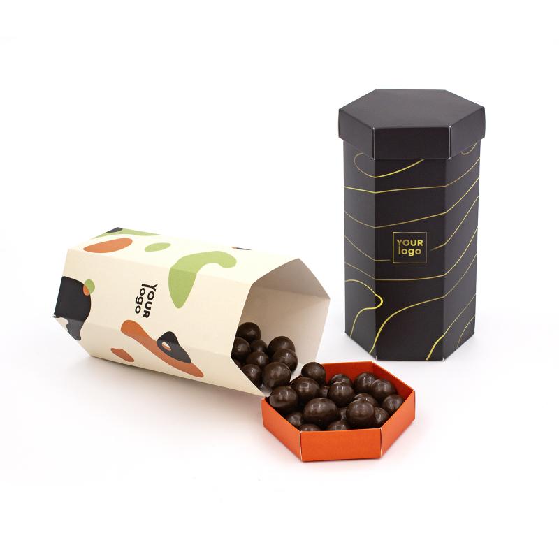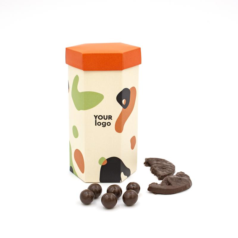Подарочная коробка конфет «Шестигранный тубус большой» с Вашим логотипом — стильное решение для корпоративных подарков или рекламных акций. Упаковка размером 175×100 мм выполнена из плотного картона (230 г) и доступна с матовым или глянцевым ламинированием. Полноцветная печать позволяет нанести яркий дизайн или логотип компании.