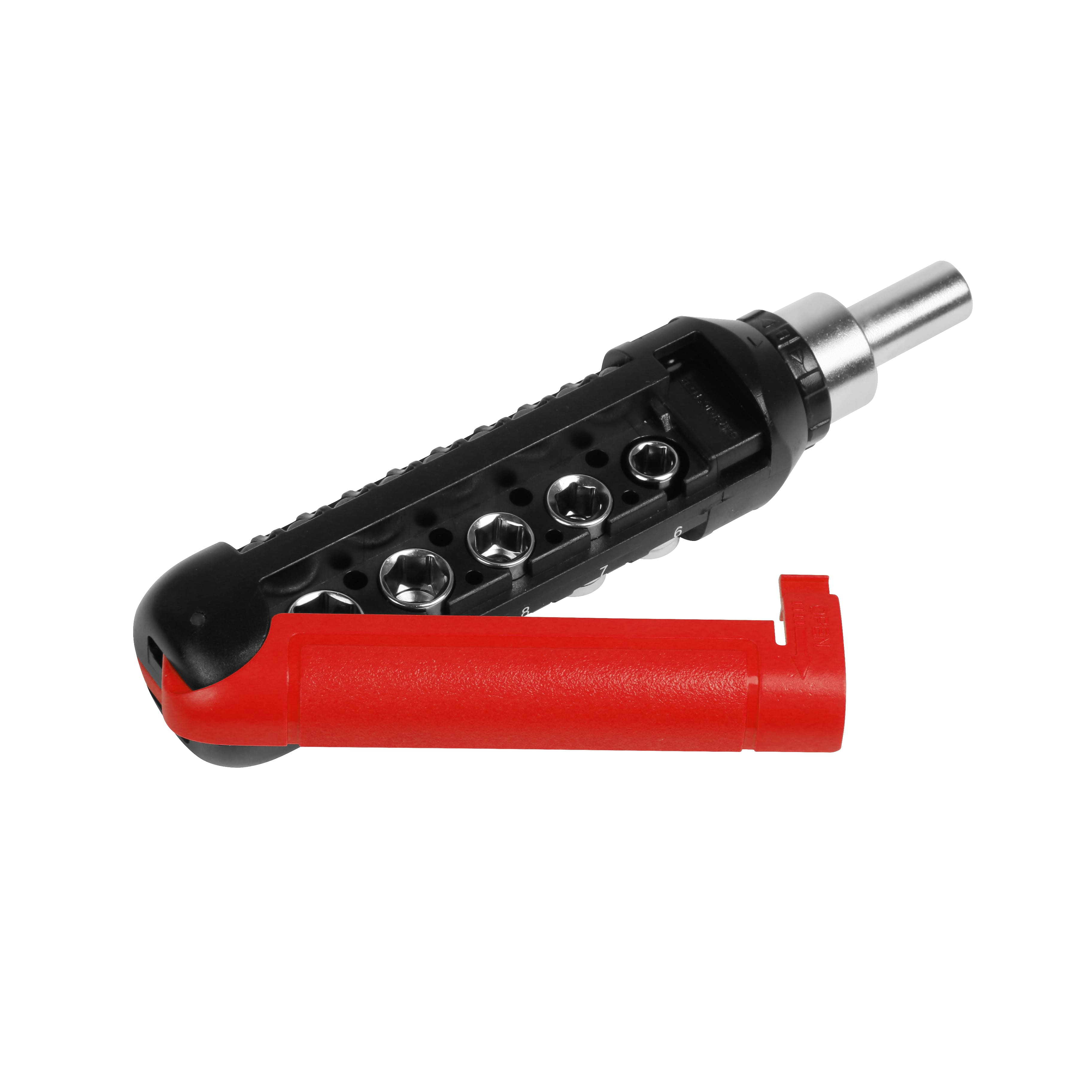 Отвертка изготовлена из пластика АБС и высококачественной стали. В комплект отвертки входит магнитный держатель, 9 бит (один адаптер – ADP, два шестигранника – Т15, Т20, три плоские – 3 мм., 5 мм.,6 мм., три крестовых – PH0, PH1, PH2) а также 5 головок торцевых ключей (6 мм., 7 мм., 8 мм., 9 мм, 10 мм.) Упакована в индивидуальную черную подарочную коробку и полиэтиленовый пакет. Размер в сложенном состоянии 16,5 см.