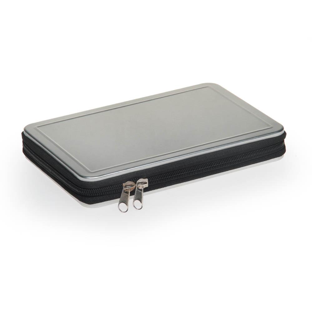 Удобный набор инструментов из 26 предметов из алюминия и стали. Набор включает: два плоскогубца, держатель с девятью разными насадками, переходник, пинцет, четыре насадки, переходник, ручку и шесть различных прецизионных инструментов.
