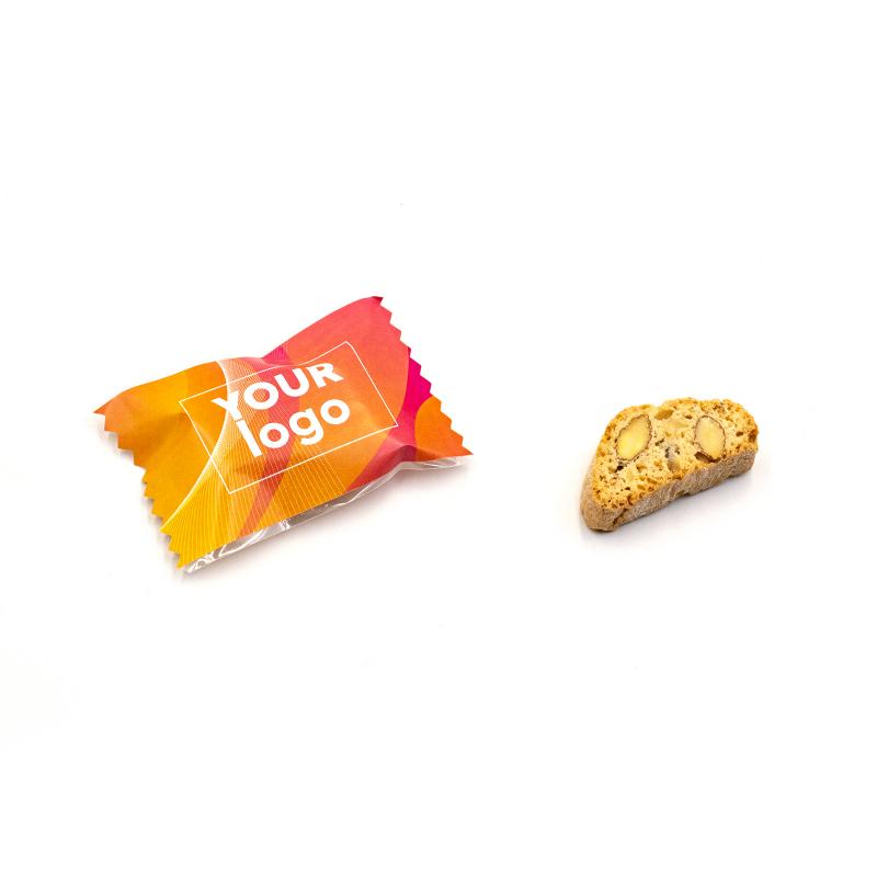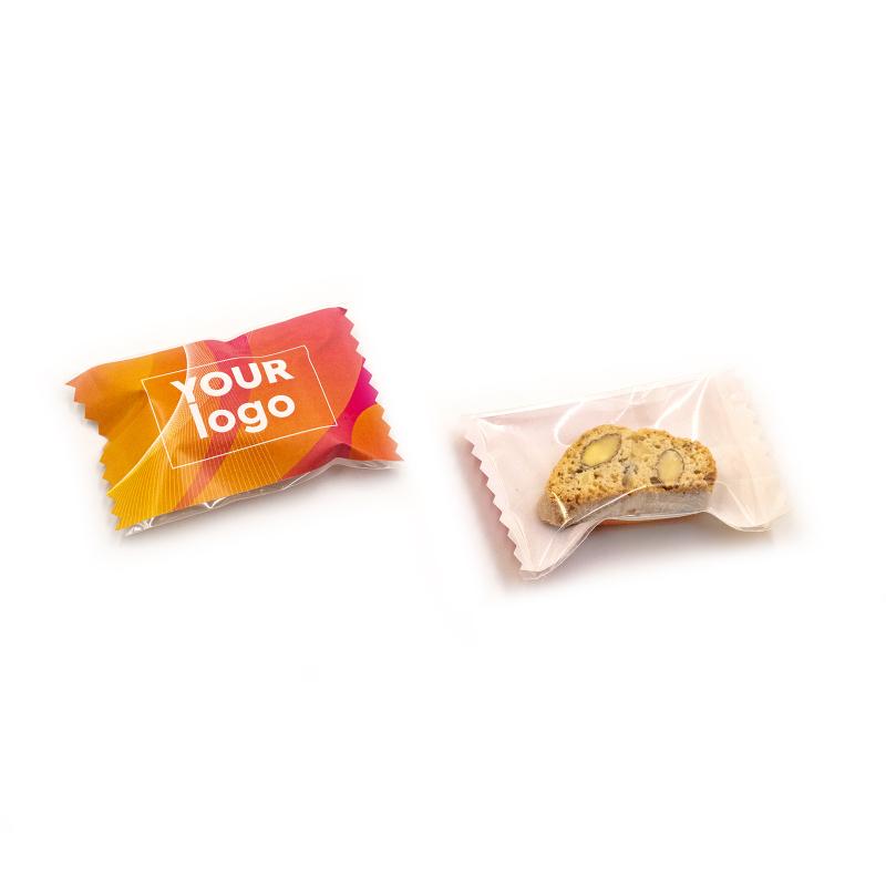 Печенье "Сantuccini" с логотипом (4,5 г) – это брендированная закуска с вариантами вкусов: клюква с шоколадом, ореховый микс, миндаль, клюква, шоколад с фундуком. Печенье упаковано в полипропиленовую плёнку с возможностью выбора прозрачной, металлической или жемчужной упаковки, на которой размещают логотип. Размер упаковки составляет 66 x 45 мм, а срок годности – 9 месяцев.