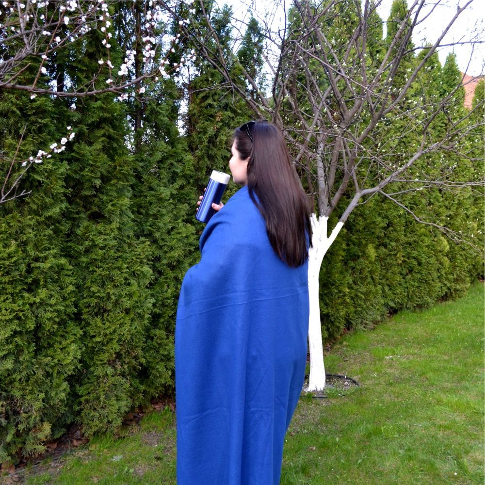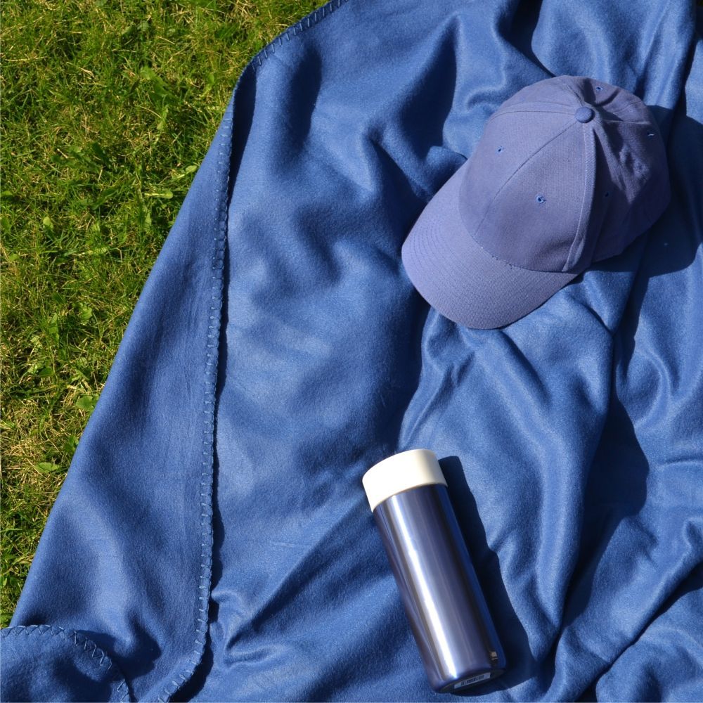 Плед изготовлен из полиэстера с достаточно высокой плотностью – 240 г/м². Ткань с такими характеристиками отлично согревает, медленно намокает и быстро сохнет. Флисовый плед имеет практичный цвет и удобный чехол для переноски.