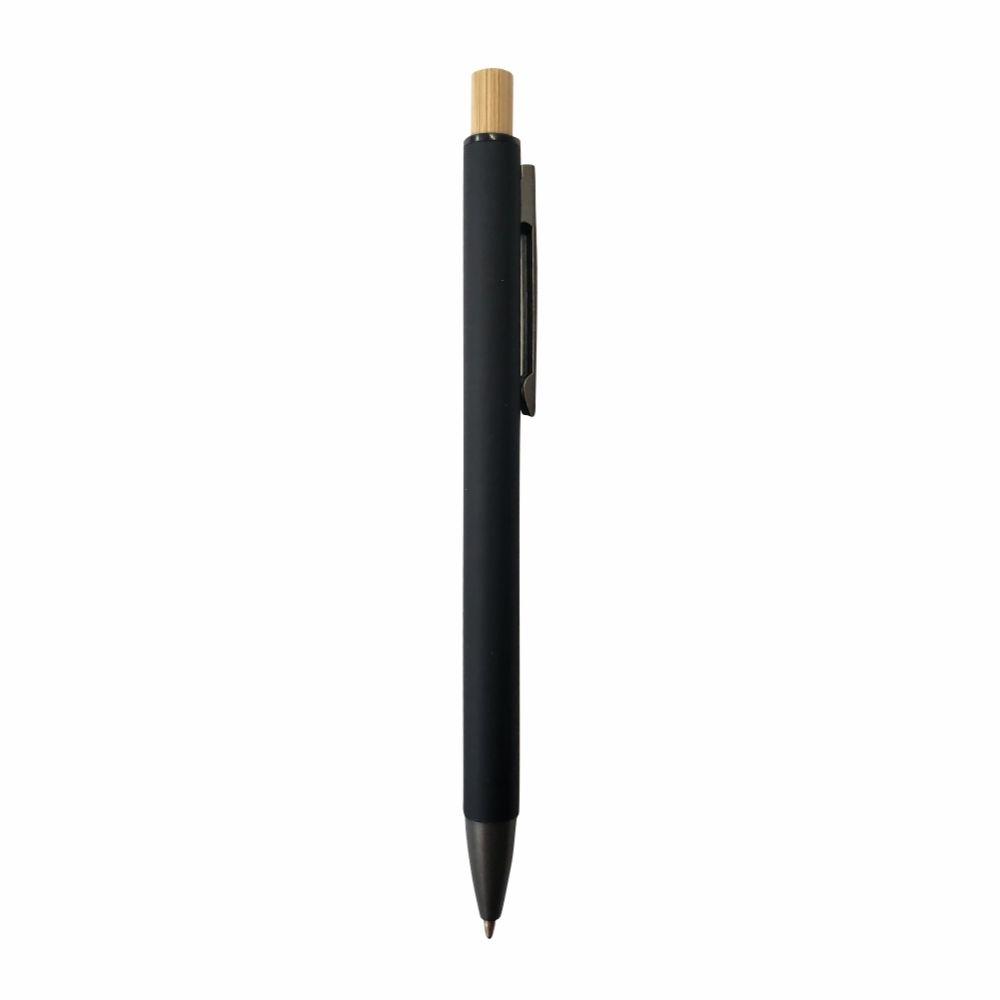 Корпус ручки изготовлен из алюминия, сверху нанесено цветное покрытие Soft touch. Изделие имеет бамбуковую кнопку.