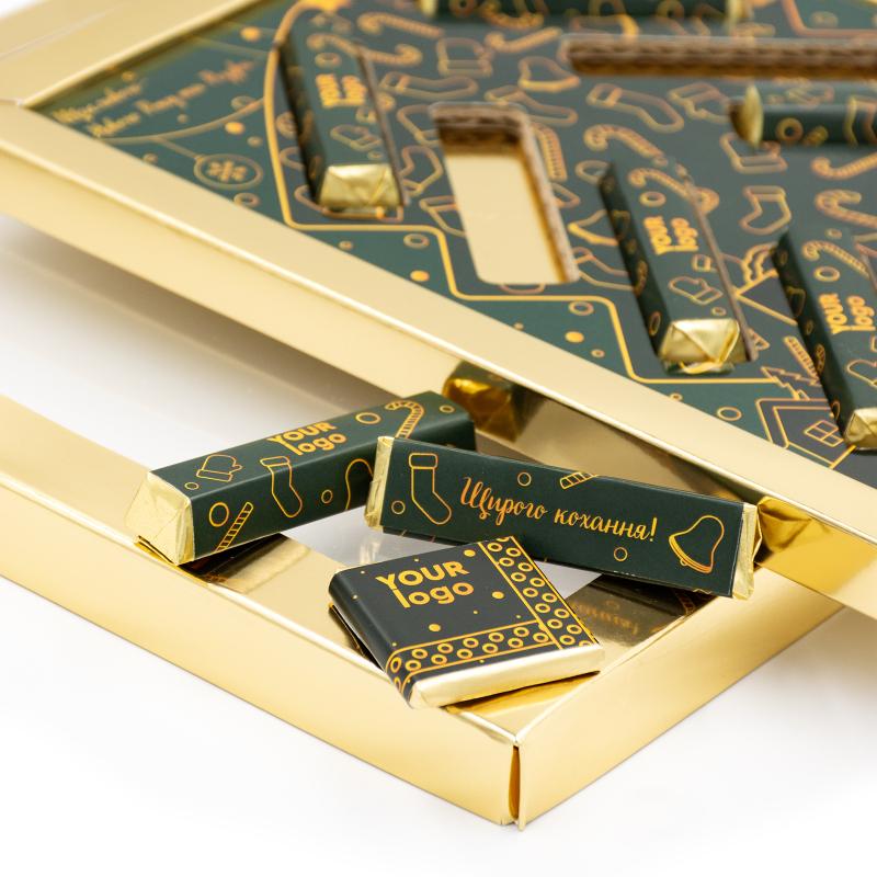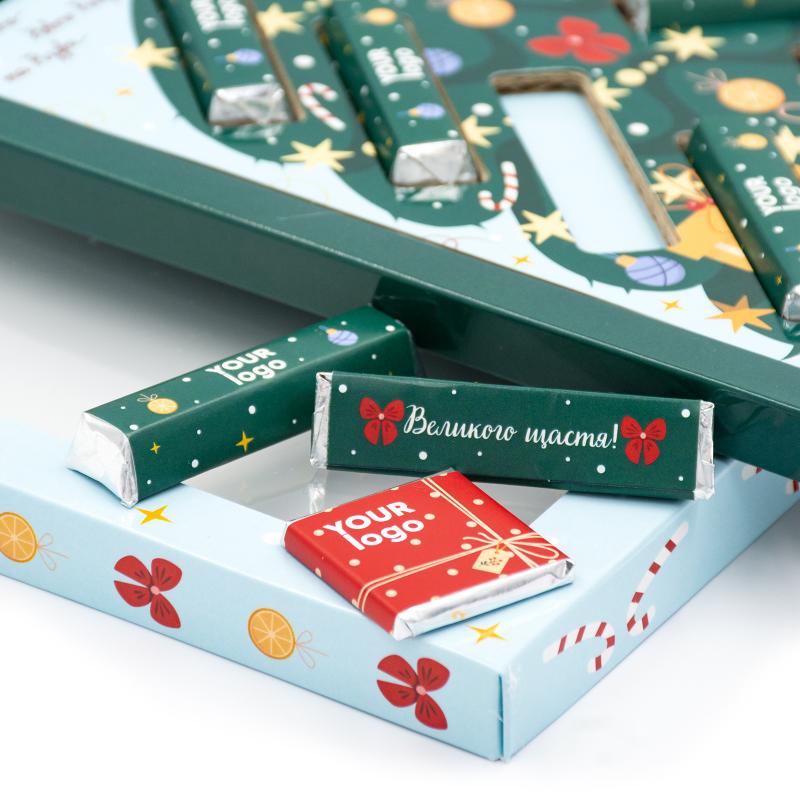 Шоколадный набор "Ёлочка" с логотипом компании, 80 г — это изысканный подарок, сочетающий вкус настоящего шоколада и стильную презентацию. В наборе — молочный (33%) и тёмный (60%) шоколад в формате плиток (4 г) и батончиков (9,5 г). Упакован в элегантную коробку типа «крышка-дно с окошком», изготовленную из плотного картона (230 г) с полноцветной печатью, возможностью премиального оформления золотом или серебром, а также с матовой или глянцевой ламинацией. Цвет фольги для шоколада — золотой или серебряный. Идеальное решение для корпоративных подарков в праздничный сезон. Размер коробки — 227 × 191 × 17 мм.