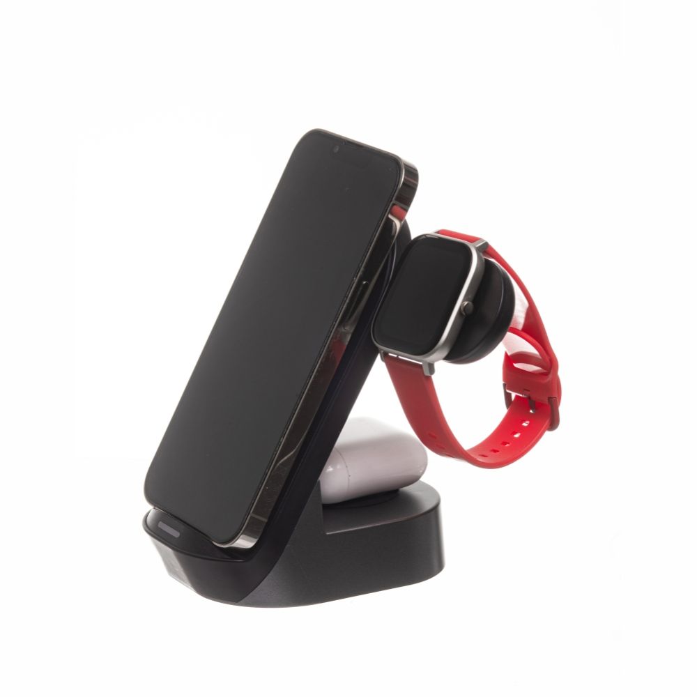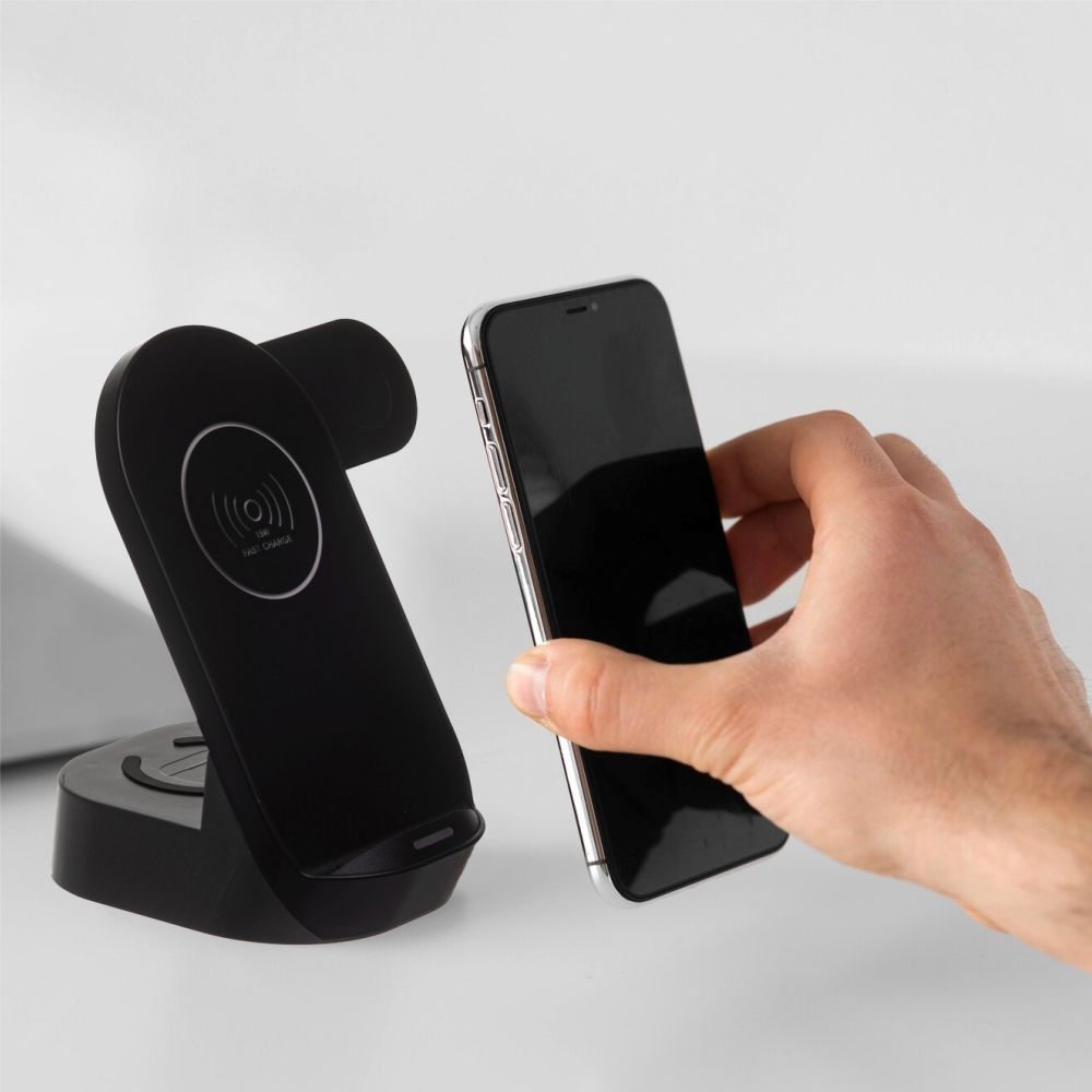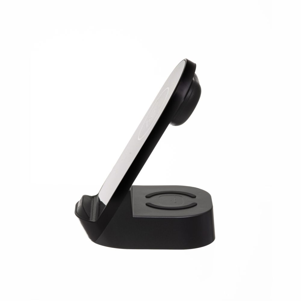 Вихідна потужність – 15 Вт. Щоб забезпечити передачу енергії, смартфон просто кладуть на опору лицьовою стороною вгору. За допомогою магнітних датчиків смартфон може кріпитися горизонтально або вертикально (книжковий чи альбомний режим).