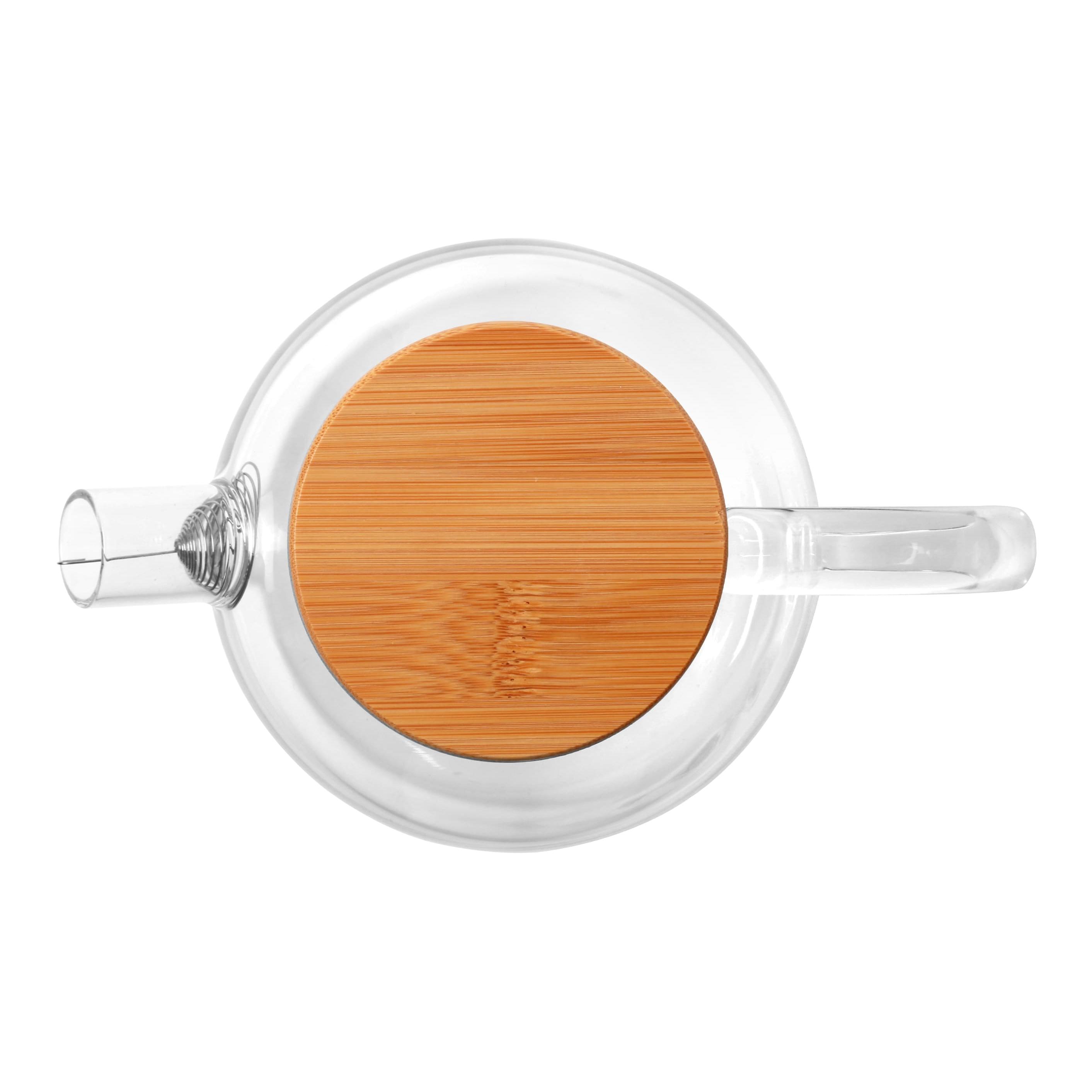Чайник заварювальний виготовлений із високоякісного, термостійкого, боросилікатного скла. Кришка виготовлена з бамбука, нержавіючої сталі та силікону, в горловині встановлена з'ємна спіраль, яка не дає виливати в чашку заварку або фрукти. Висота 19 см., діаметр 13,8 см. Об'єм 1800 мл. Запакований в індивідуальну, картонну подарункову коробку та повітряно-бульбашковий пакет для кращого зберігання при транспортуванні. Розмір індивідуальної коробки: 20 х 17,4 х 14,4 см. Метод нанесення: гравіювання на бамбукову кришку, деколь на скляну колбу. Діаметр кришки 8,5 см.