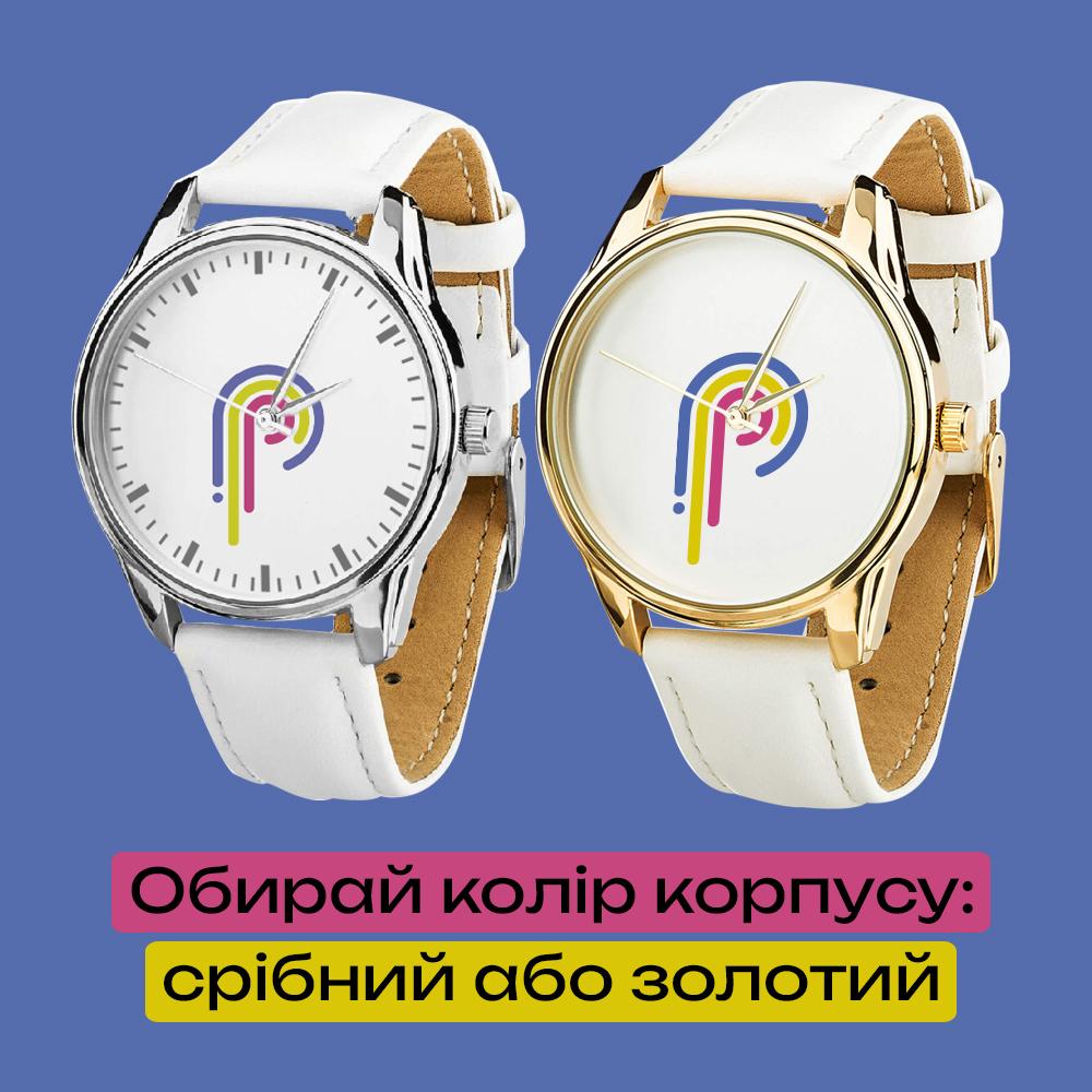 Годинник наручний сріблястий з кольоровим ремінцем з екошкіри з вашим лого