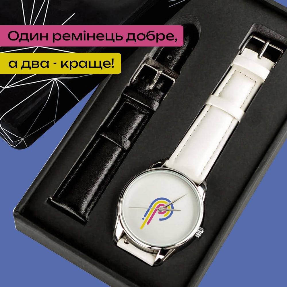 Рекомендуємо доповнити годинник другим змінним ремінцем: один - сміливий та корпоративний, інший - темний та консервативний. Екошкіра, що використовується в ремінцях, не тільки стійка до часу, але й приємна на дотик, гарантуючи комфорт у будь-якій ситуації. І хоч технічно на ремінець не можна наносити логотип, підібравши колір ремінця у кольорах логотипу ви створите стильне рішення кольору та унікальний корпоративний атрибут.