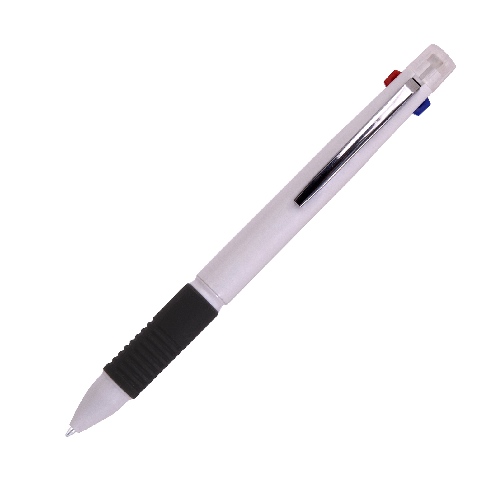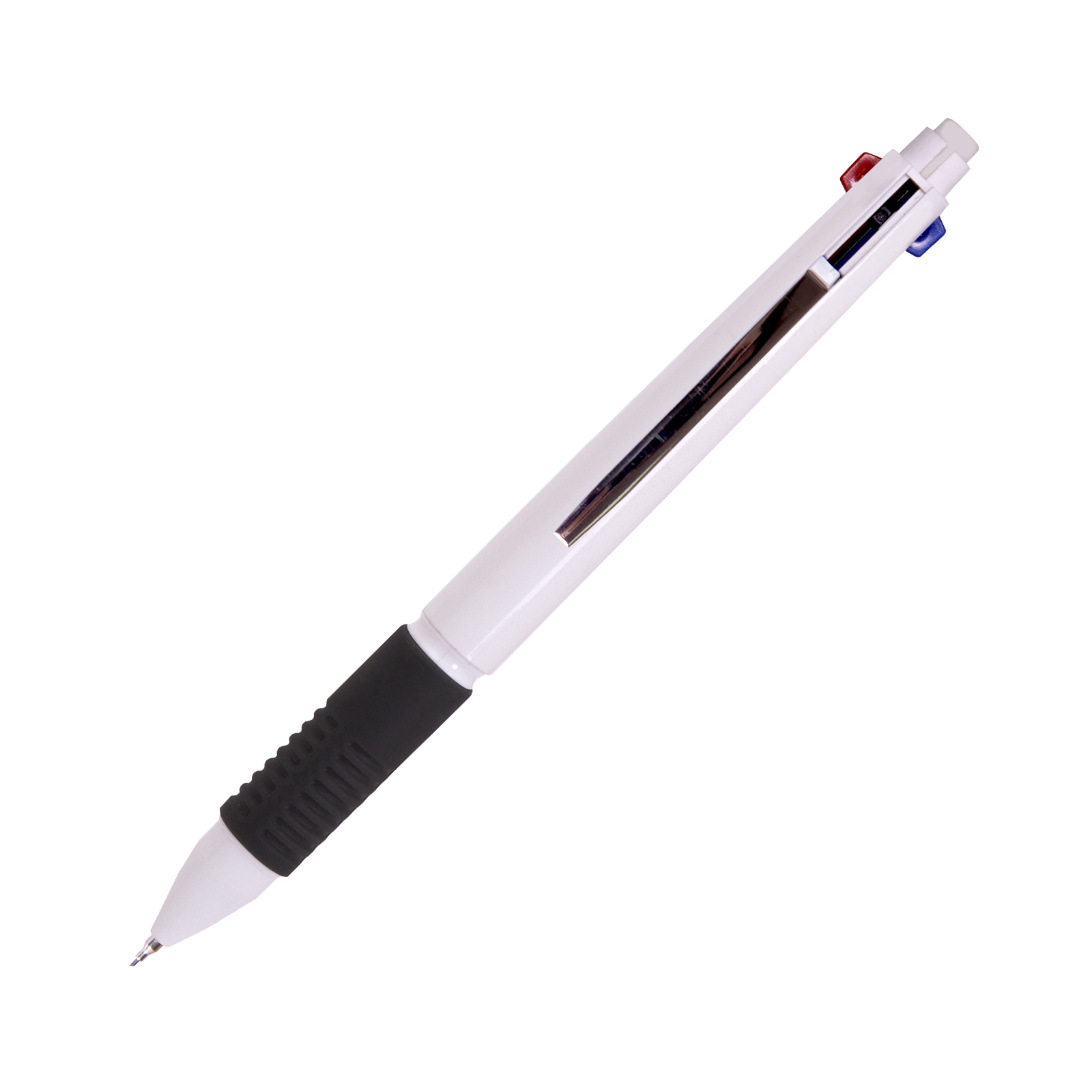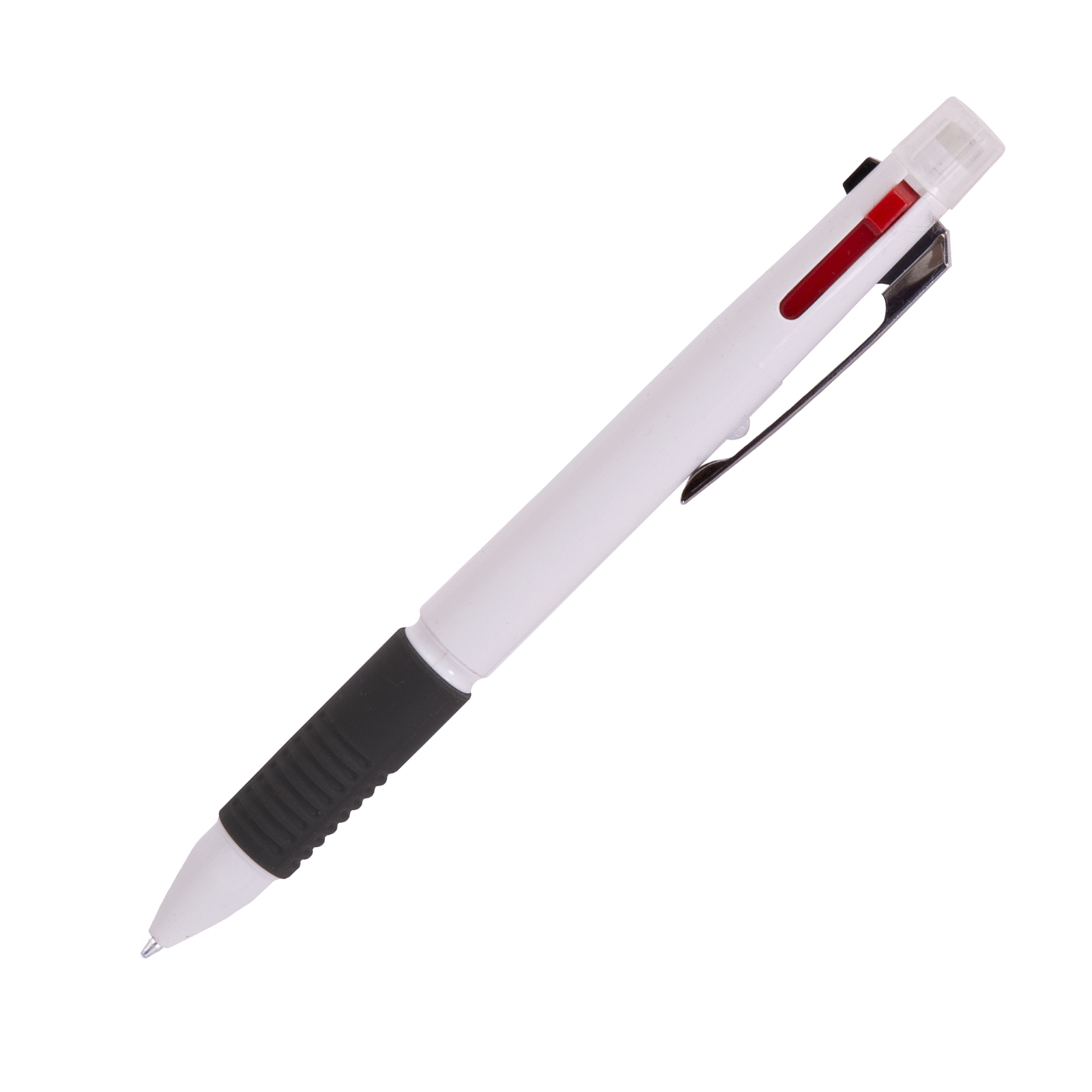 Біла кулькова ручка 4 в 1 під нанесення логотипу! Змінюйте в один клік колір чорнила (чорний, синій, червоний) або пишіть вбудованим олівцем.