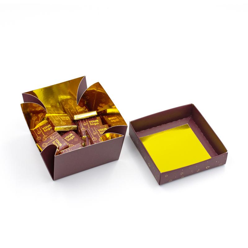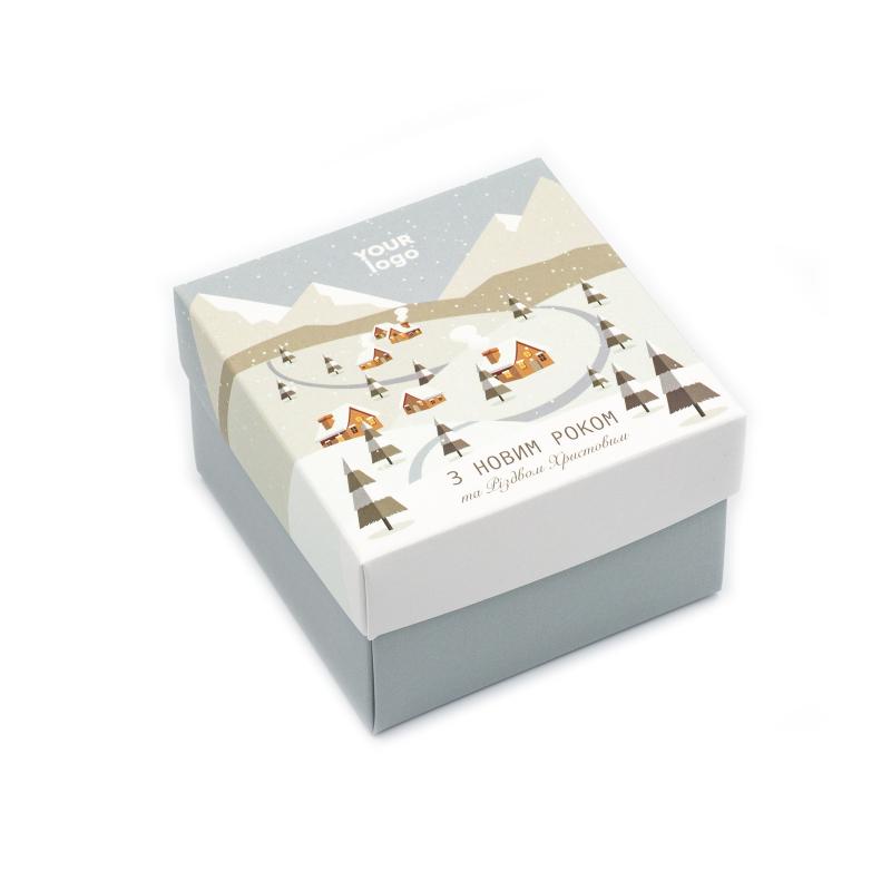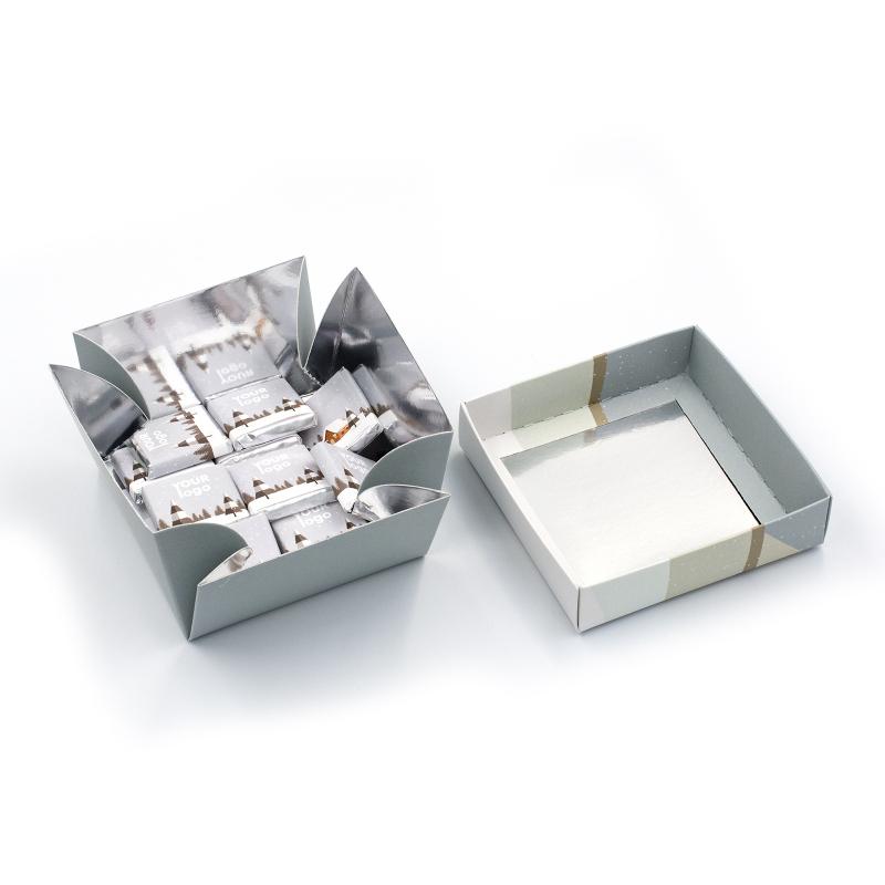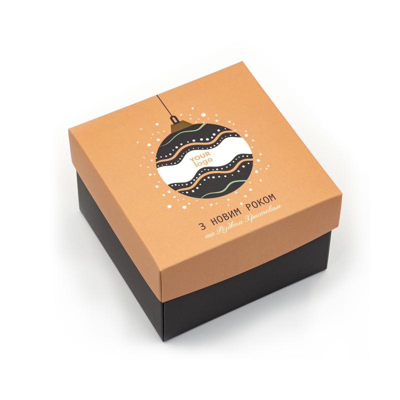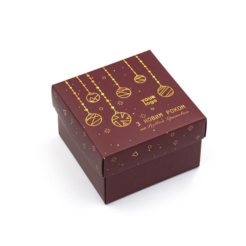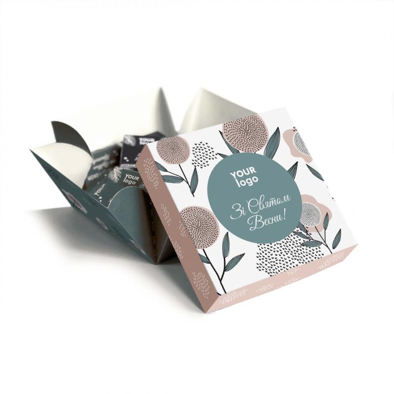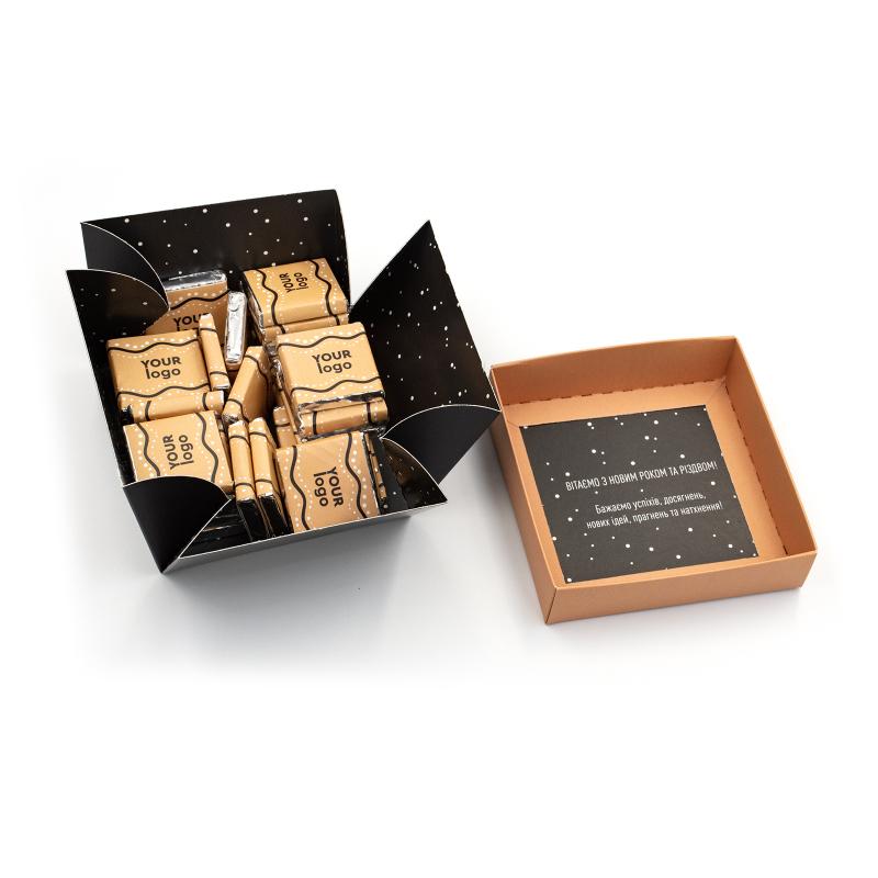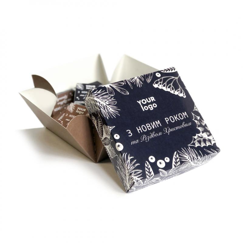 Шоколадний набір "Куб" 150 г з індивідуальним логотипом — це стильний подарунок із вишуканим наповненням на вибір: чорний шоколад 60%, молочний 33% або мікс. Упакований у якісну картонну коробку (230 г/м²) з кольоровим друком, ламінацією (матовою або глянцевою). Розмір коробки — 90×94×62 мм. Етикетка — крейдований папір 90 г/м². Колір фольги для цукерок — золото або срібло. Додаткові послуги: двосторонній друк 4+4, фольгування (золото/срібло), внутрішнє ламінування золотом або сріблом. Ідеально підходить як корпоративний сувенір.