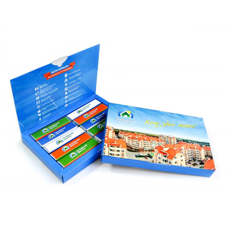 Шоколадний набір «Ригель» — це поєднання смачного молочного шоколаду з ніжною молочною начинкою в подарунковій упаковці типу "Книга". Вага — 125 г, розмір — 175 × 115 × 20 мм. Упаковка виготовлена з щільного картону (230 г) з повнокольоровим друком і ламінуванням — матовим або глянцевим на вибір. Шоколад загорнутий у фольгу золотого або срібного кольору. Тип продукції: шоколадний батончик з начінкою. Ідеальне рішення для корпоративних подарунків з можливістю нанесення логотипа.