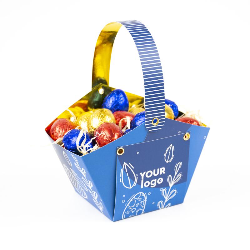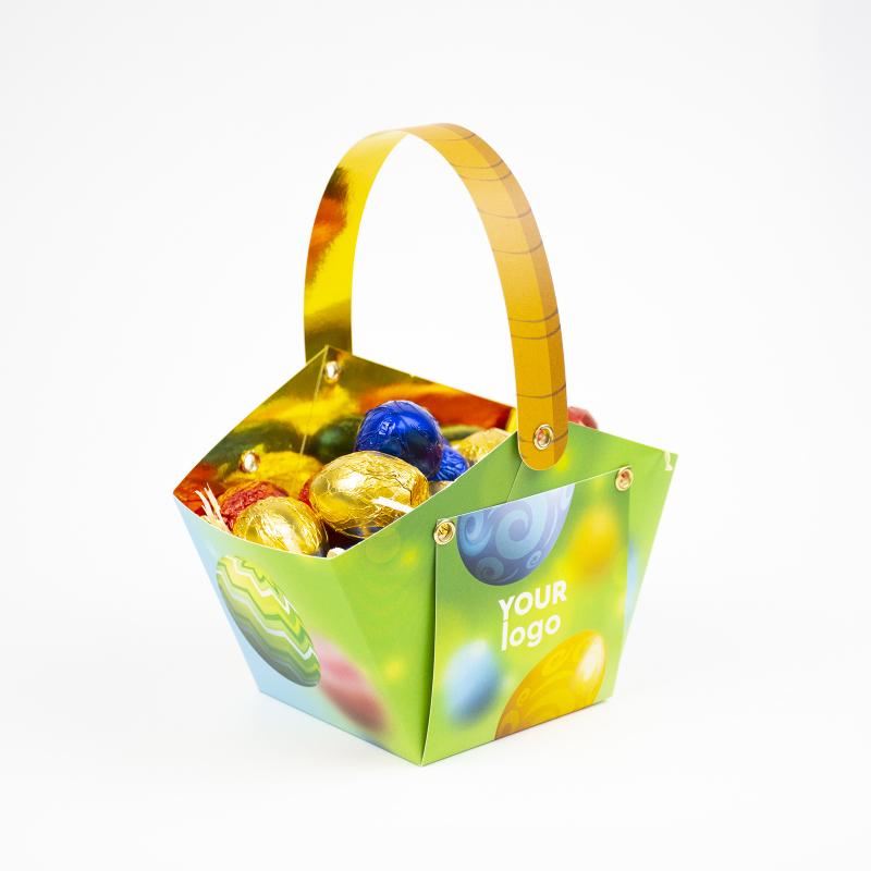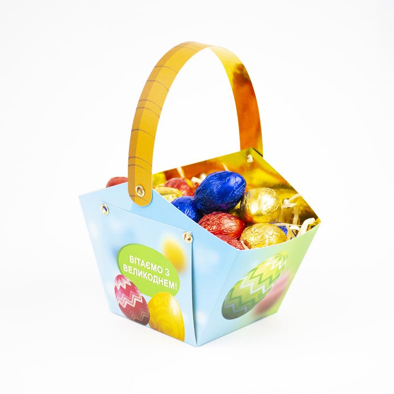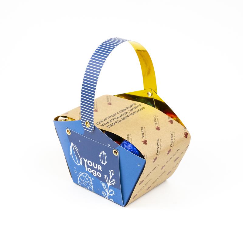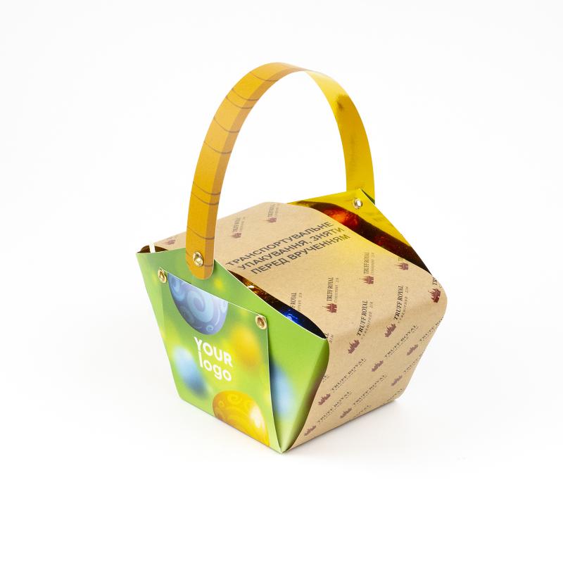 Кошик виготовлено з картону щільністю 230 г, доступне матове або глянцеве ламінування. Друк повнокольоровий. Можливе преміум-оформлення: giold/silver.
