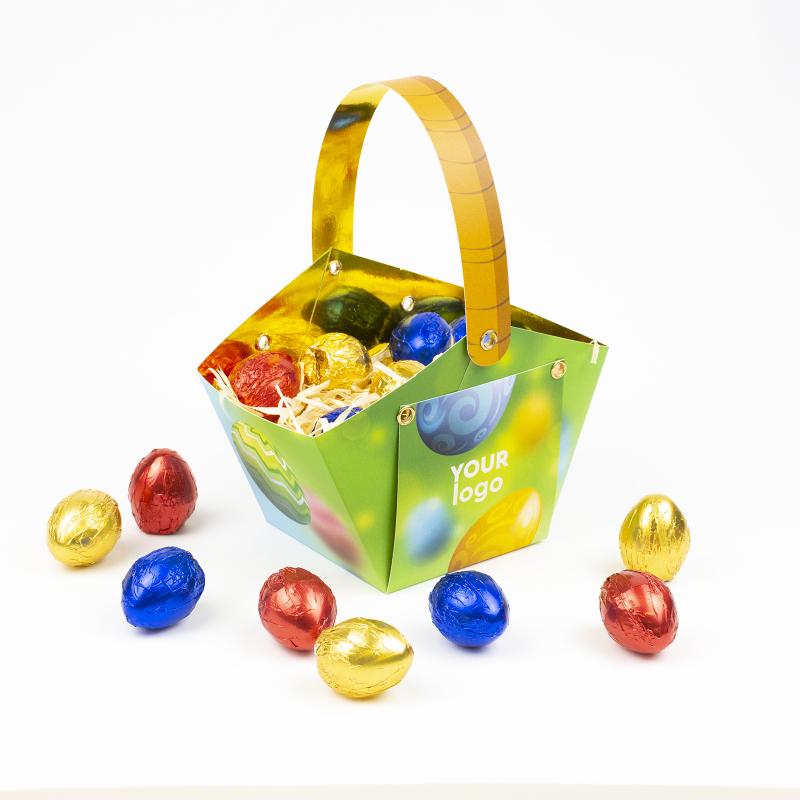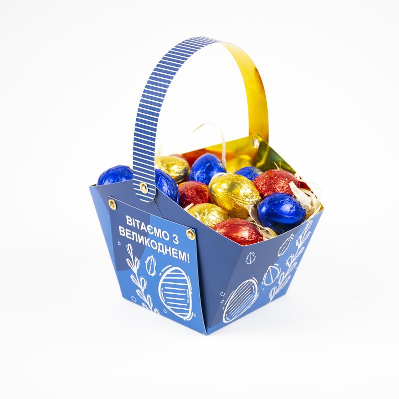 Великодній кошик 210 г з логотипом "Смак" — елегантний подарунковий набір у святковому дизайні. Включає 15 яєць із білого шоколаду з ніжною кремовою начинкою. Кожне яйце загорнуте в фольгу кольору золота, синю, червону або мікс трьох кольорів.