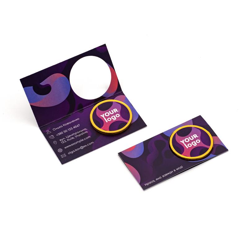 Подарункова візитка з шоколадною медаллю — ідеальне рішення для презентацій, нагороджень, акцій чи корпоративних заходів. Вона поєднує в собі естетику, якість і практичність.