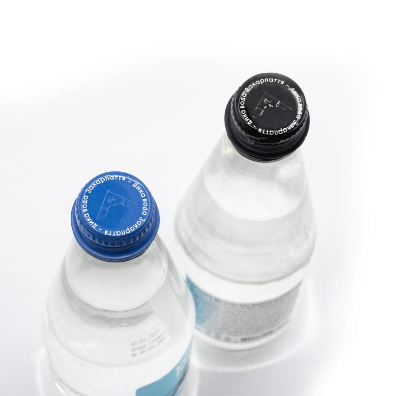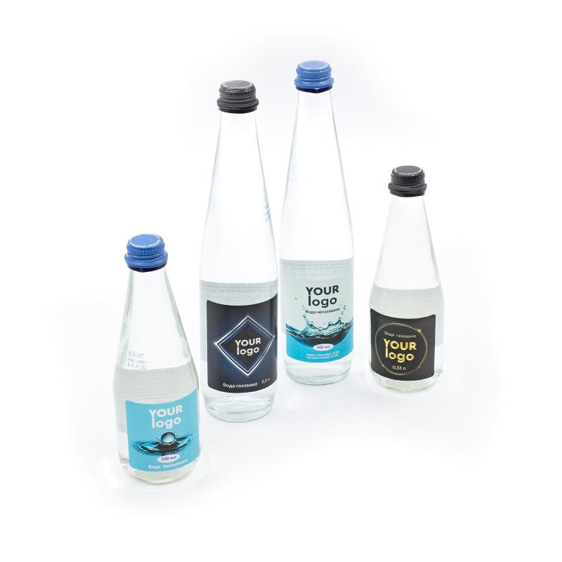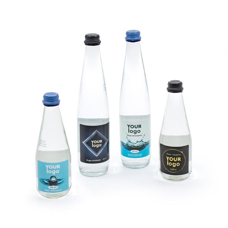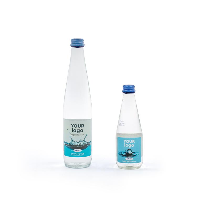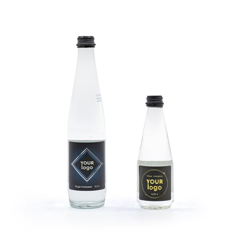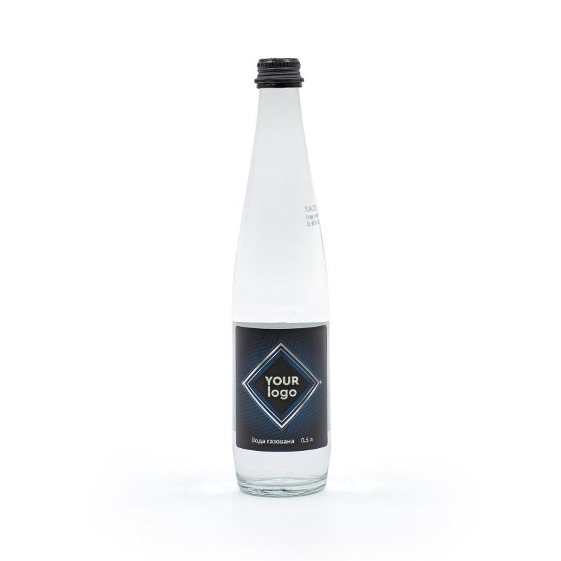 Натуральна мінеральна вода у скляній пляшці об’ємом 0,5 л (D60 мм, H280 мм). Доступна у варіантах: негазована або сильногазована.