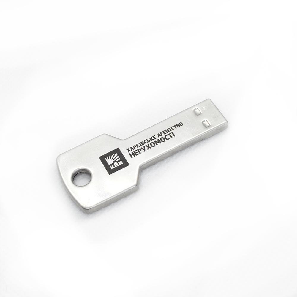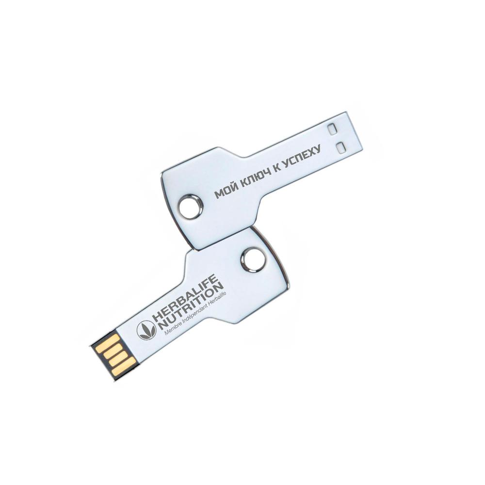 Флешка в форме ключа производится из прочного металла, который окрашен в различные цвета. Чип данных вмонтирован в литой корпус устройства. Благодаря этому флешка в виде ключа не нуждается в колпачке, а записанная информация защищена от утери при ударе. Уникальный внешний вид, а также возможность нанесения логотипа или надписи позволяют использовать флешку в качестве рекламного инструмента или запоминающегося подарка для партнёров и сотрудников. А специальное отверстие позволяет носить портативное устройство как брелок.