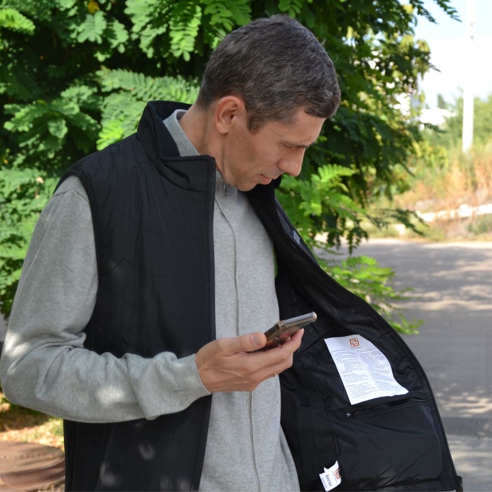 Жилет имеет 4 зоны нагрева – спереди справа и слева, на воротнике и на спинке. Углеродные нагревательные элементы работают от любого внешнего аккумулятора (пауэрбанк в комплект не входит).